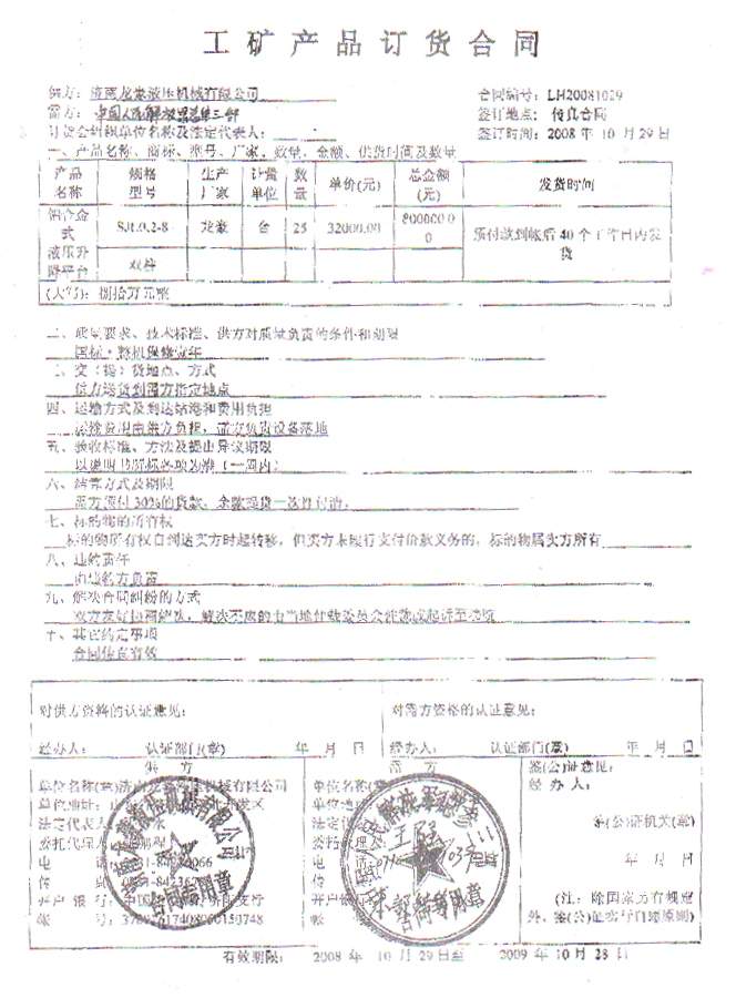2008年10月28日中國(guó)人民解放軍總參三部物資處3名解放軍干部來(lái)我公司實(shí)地考察。考察比較后對(duì)我公司的規(guī)模和產(chǎn)品給予了極大的肯定,并就一直聯(lián)系的要購(gòu)買的25臺(tái)鋁合金升降機(jī)簽訂了訂貨合同?,F(xiàn)我公司已按照約定如期交貨,總參三部驗(yàn)收后非常滿意,并已全部付款到位。